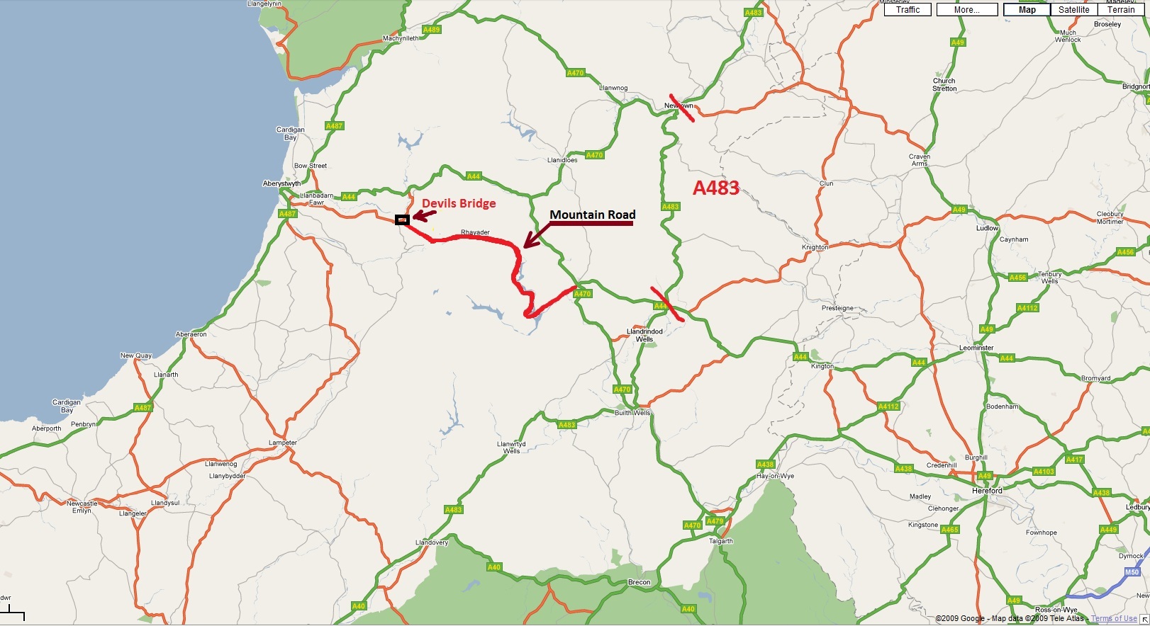 Trasa zaczyna sie na skrzyzowaniu A44 z A470 i biegnie posrod walijskich gor. Mountain road konczy sie w Devils Bridge ale to nie jest koniec trasy i mozna samemu zdecydowac czy chcemy dojechac do Aberystwyth czy odbic na polnoc i dojechac do drugiej mojej propozycji (patrz ponizej).