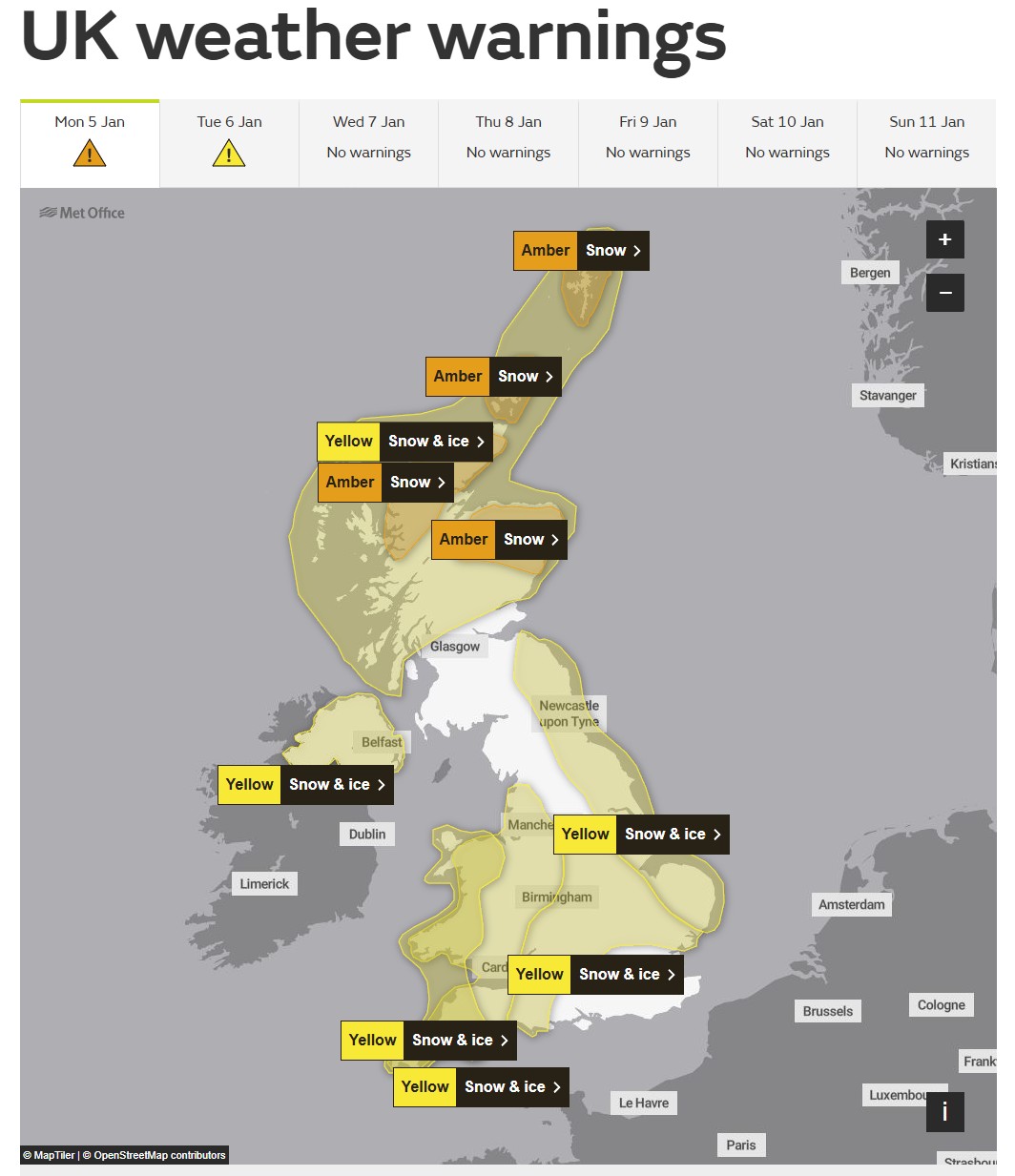 Met Office wydał jednocześnie liczne ostrzeżenia przed śniegiem i oblodzeniem, które obejmują obszary od południa Anglii aż po północną Szkocję.